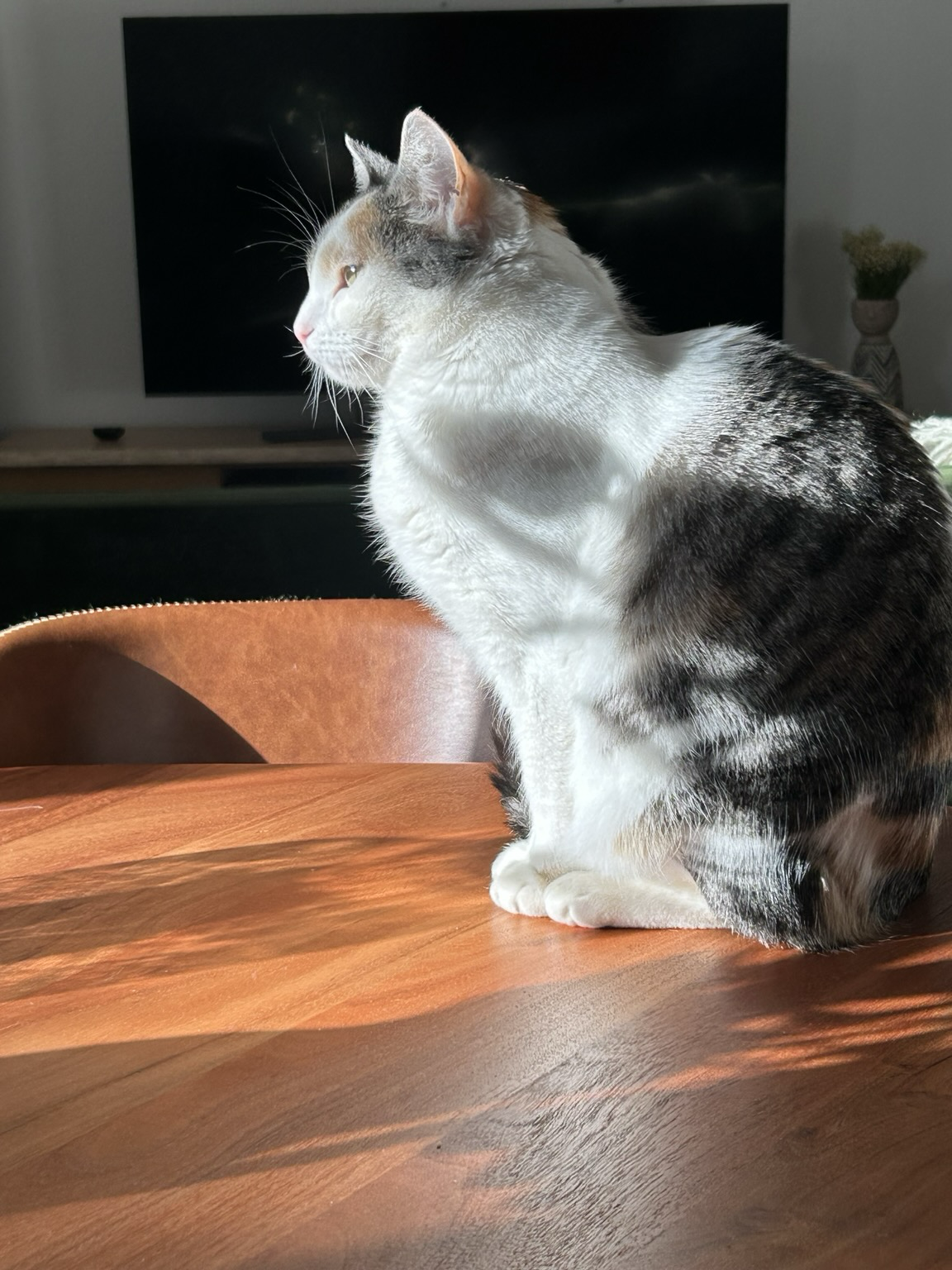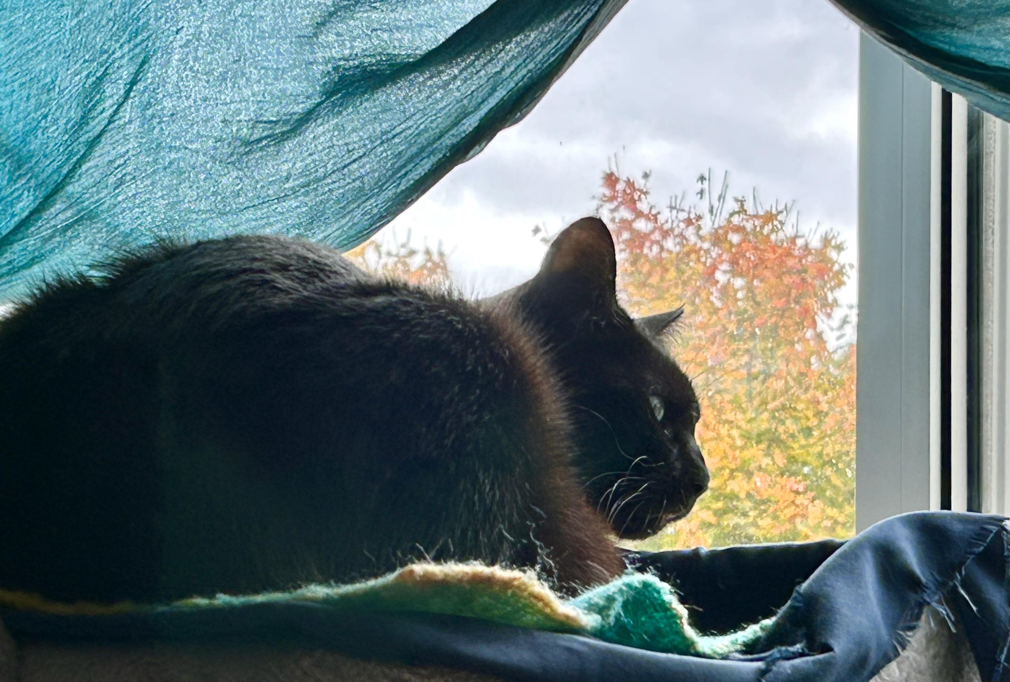 It’s very windy and rainy again today and Ava is watching the leaves fly by like golden birds. She is very alert 😄