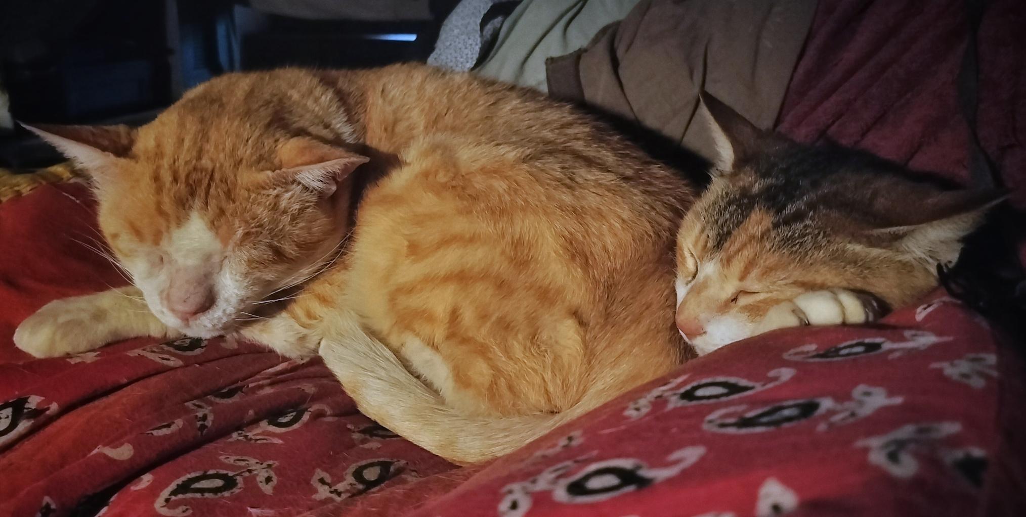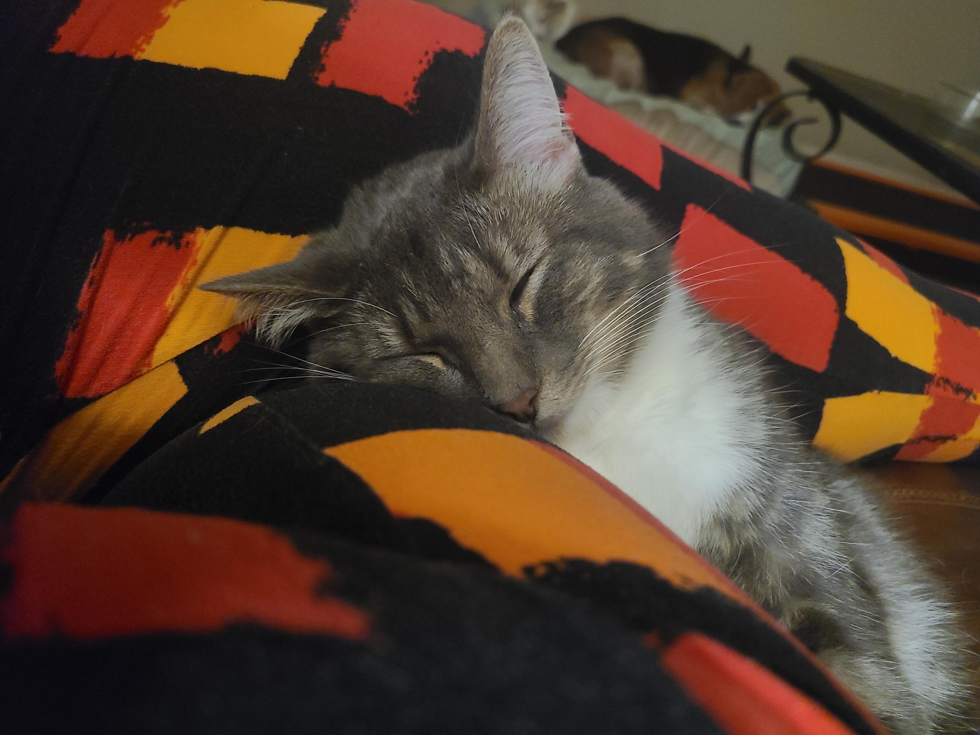 These cats all just use each other as furniture. Here featuring Petunia using her mother Primrose as a pillow (and Primrose dangling off the edge of the bed once she woke up).