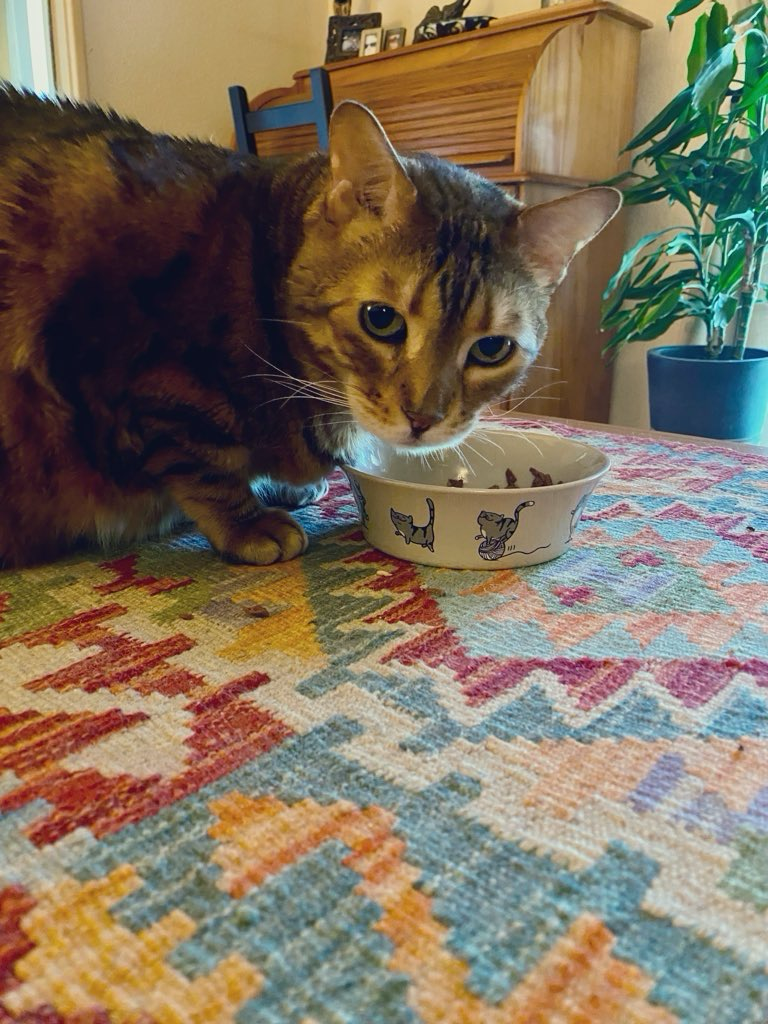 Ollie's (Ontario, Canada) cat sitter gave her lickable puree treats before bed while her human was away for a week. Now that he's back she has to meow reminders at him every night that this is the new routine.