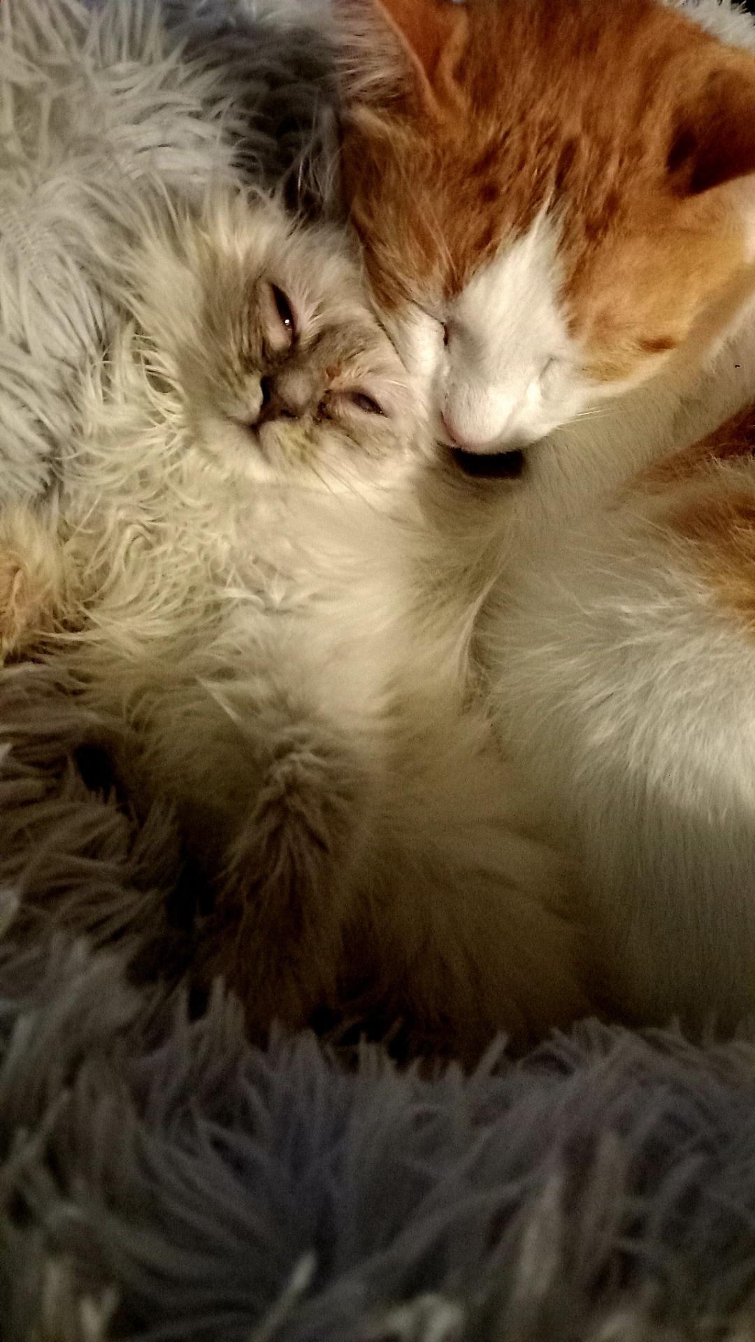 Petunia and Sumie often cuddle together on my chair, so when I saw a brown cat and a grey cat together when entering my office this evening I had to do a double-take.