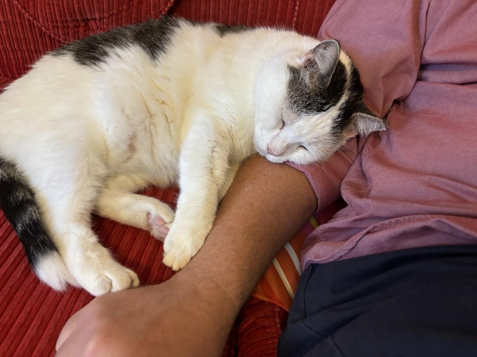 Still hand-feeding Momo the cat while he recovers from Feline Infectious Anemia.