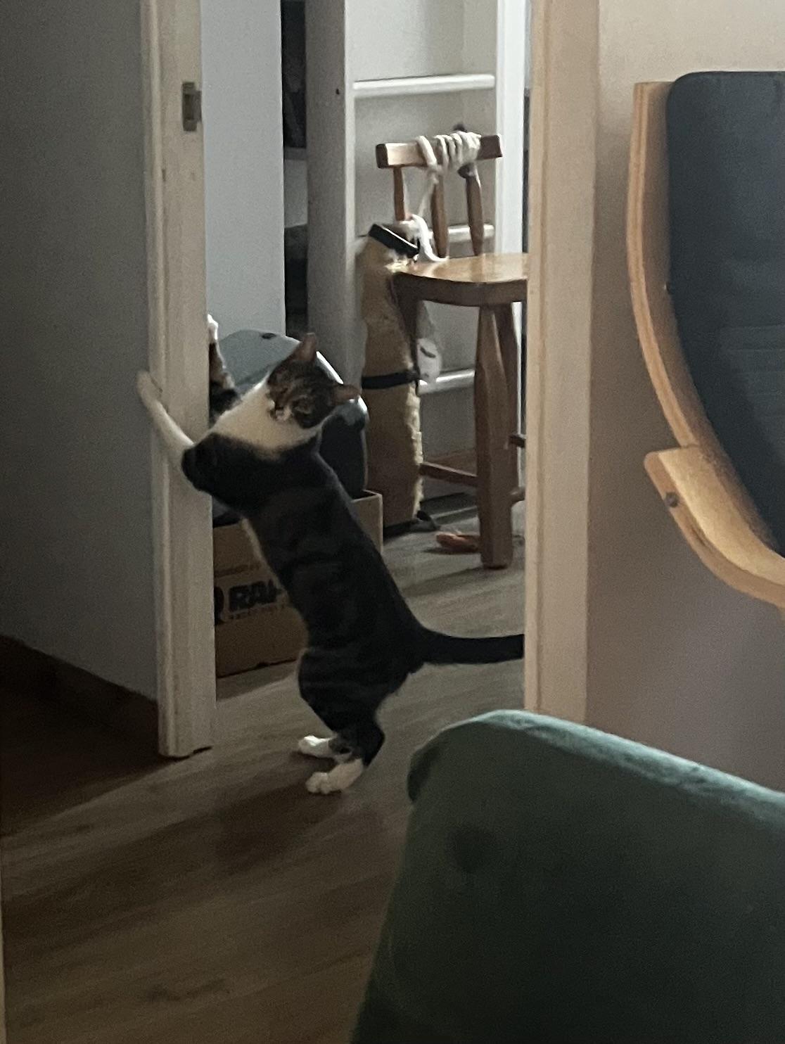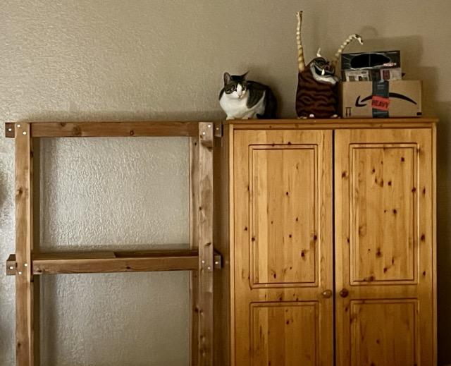 Our human did some cleaning this week. We can now keep an eye on him from a safe distance and get some exercise climbing the shelf to the top of the wardrobe. Here's my brother Leo demonstrating his verticality. #Caturday #Cats #Catsofmastodon